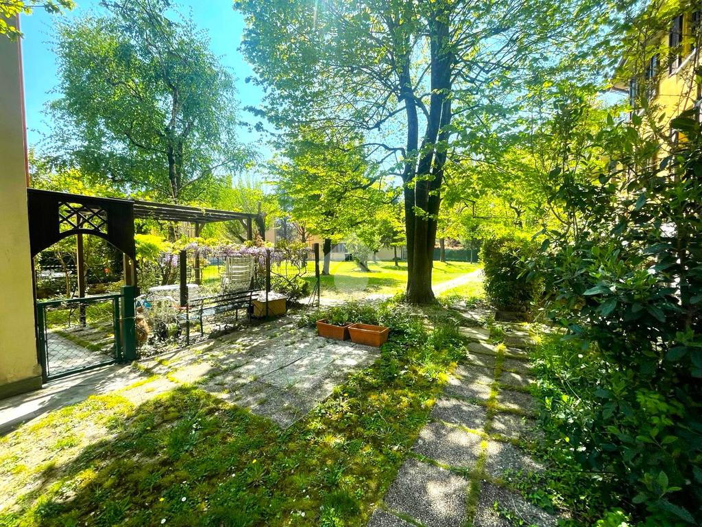 Completa l'abitazione un riservato giardino condomianiale, due posti auto di proprietà e un garage (€20.000).